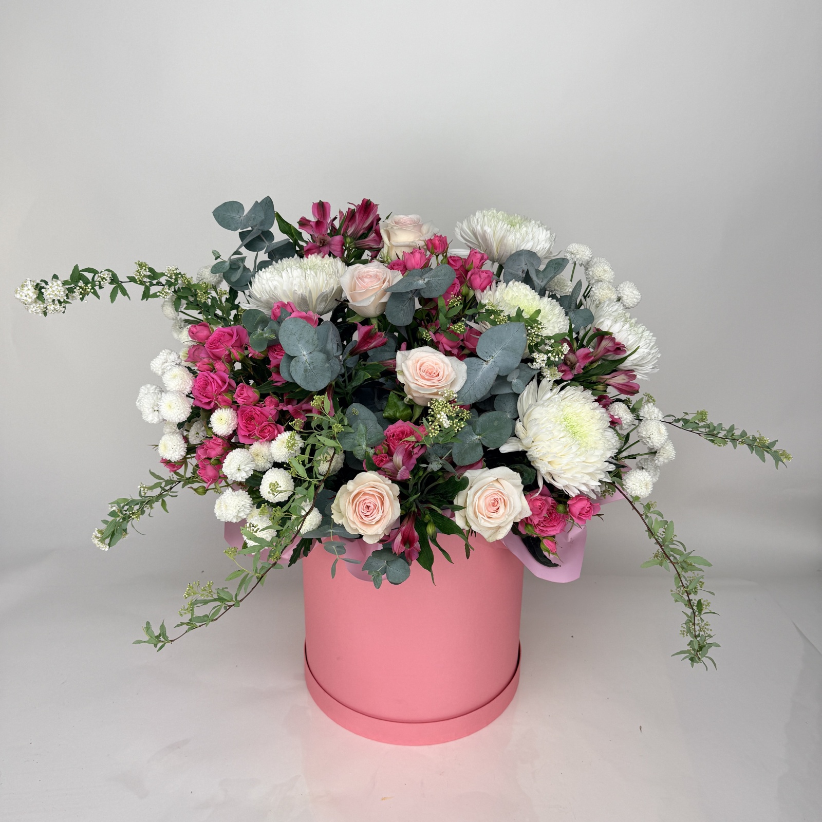 Состав: хризантема 5, роза 5, хризантема кустовая 5, эвкалипт 4, альстромерия 4, роза кустовая 2, рускус 0,5 и прочее. под заказ