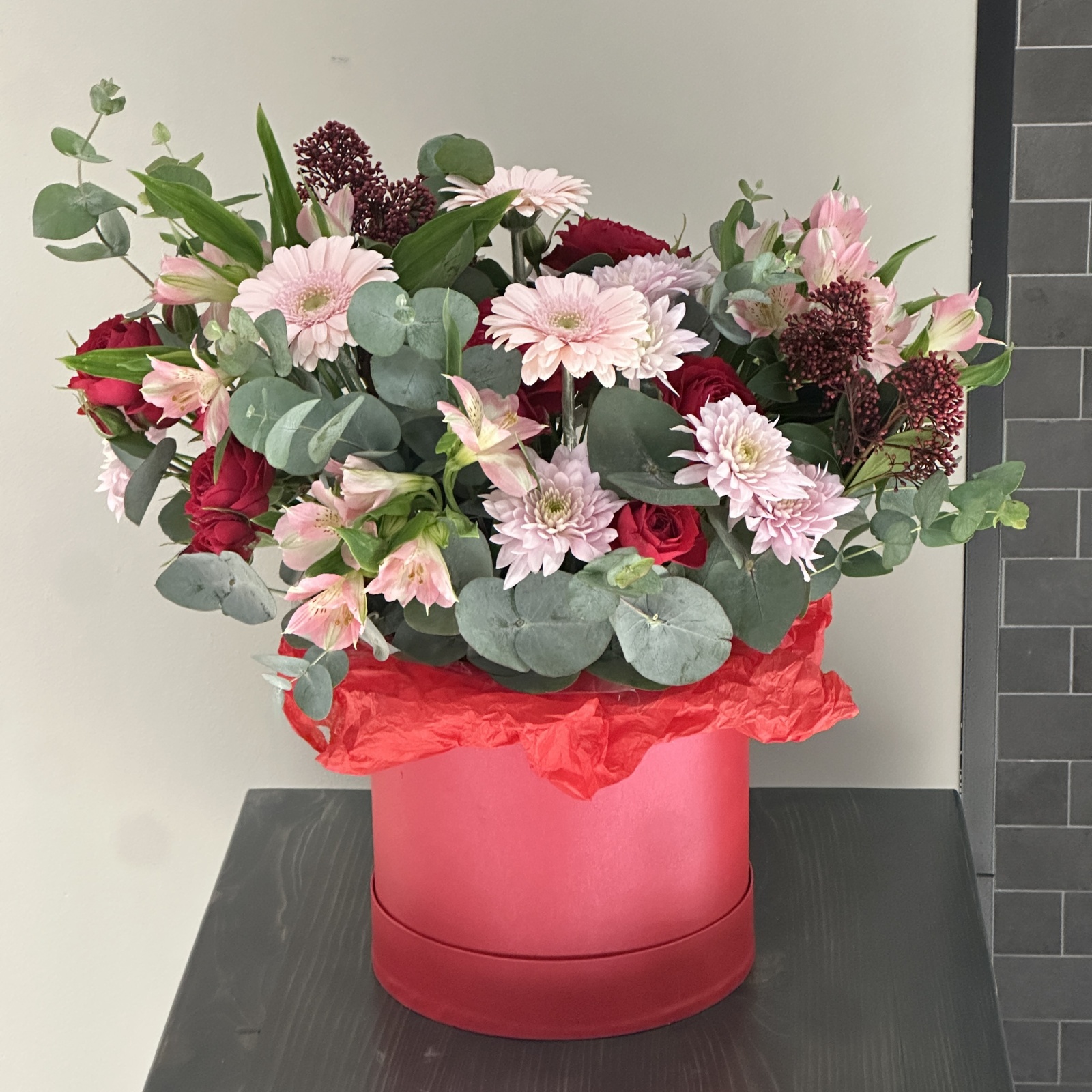Состав: альстромерия 3, гербера 3, эвкалипт 3, роза кустовая 1, хризантема кустовая 1 и прочее. в наличии