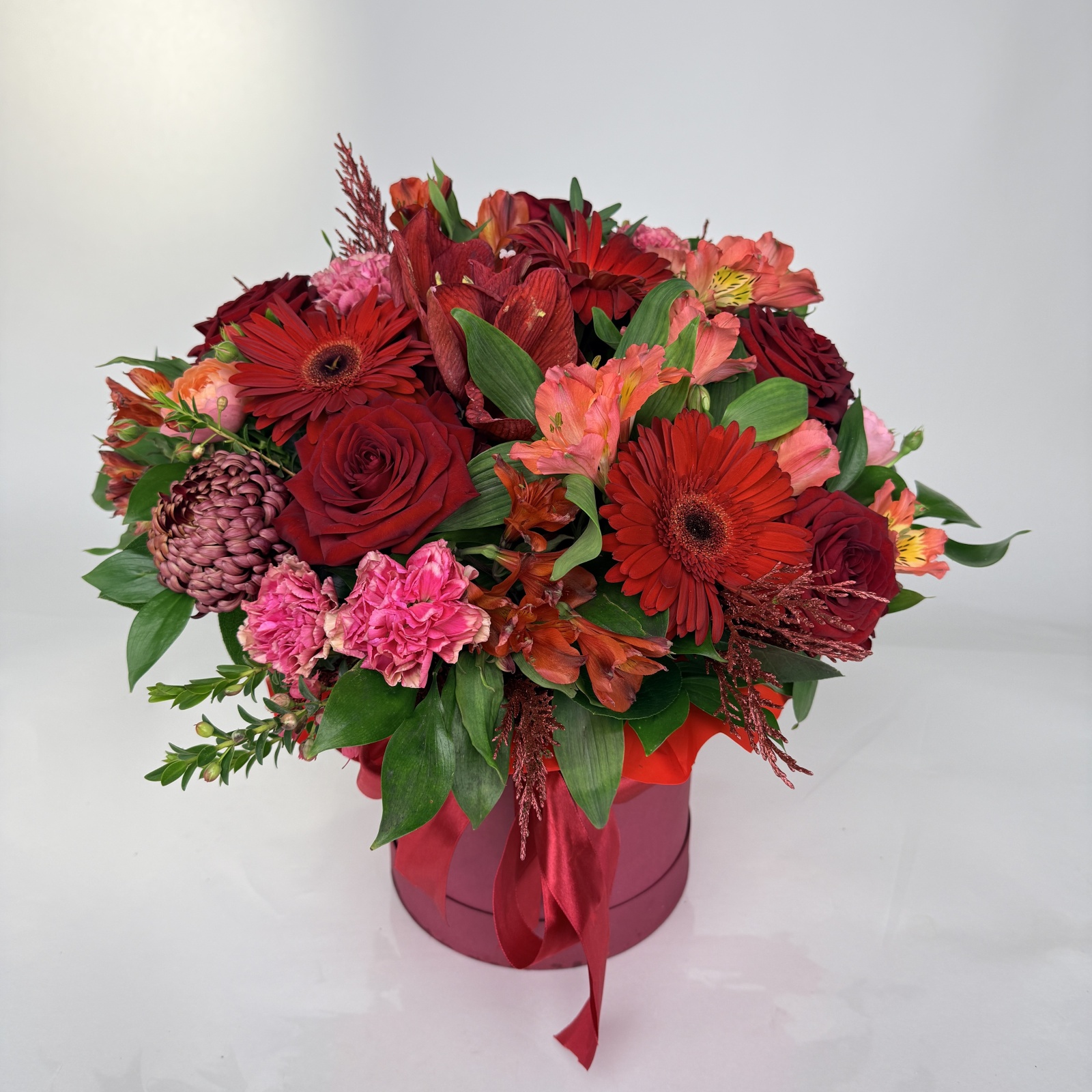 Состав: роза 6, альстромерия 5, гвоздика 5, гербера 3, гиппеаструм 1, хризантема 1, рускус 0,5 и прочее.