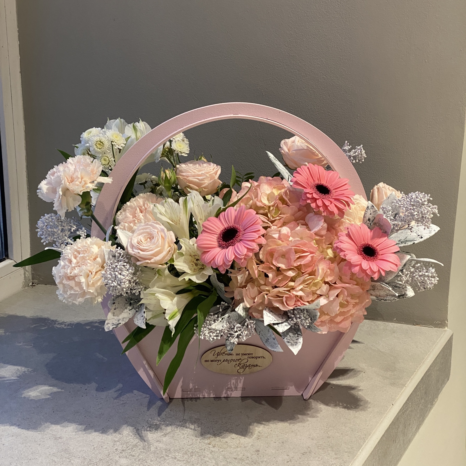 Состав: гвоздика 3, гербера 3, альстромерия 2, гортензия 1, роза кустовая 1, хризантема кустовая 1 и прочее. в наличии