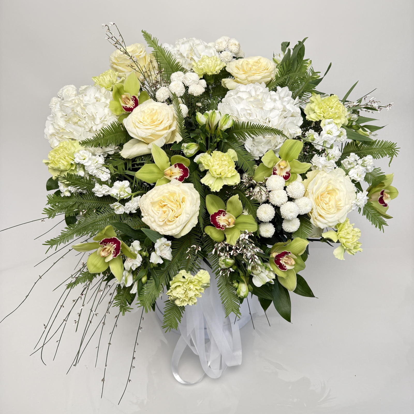Состав: гвоздика 7, хризантема кустовая 5, роза 5, альстромерия 5, гортензия 3, маттиола 3, ветка цимбидиум 0,4 и прочее. под заказ