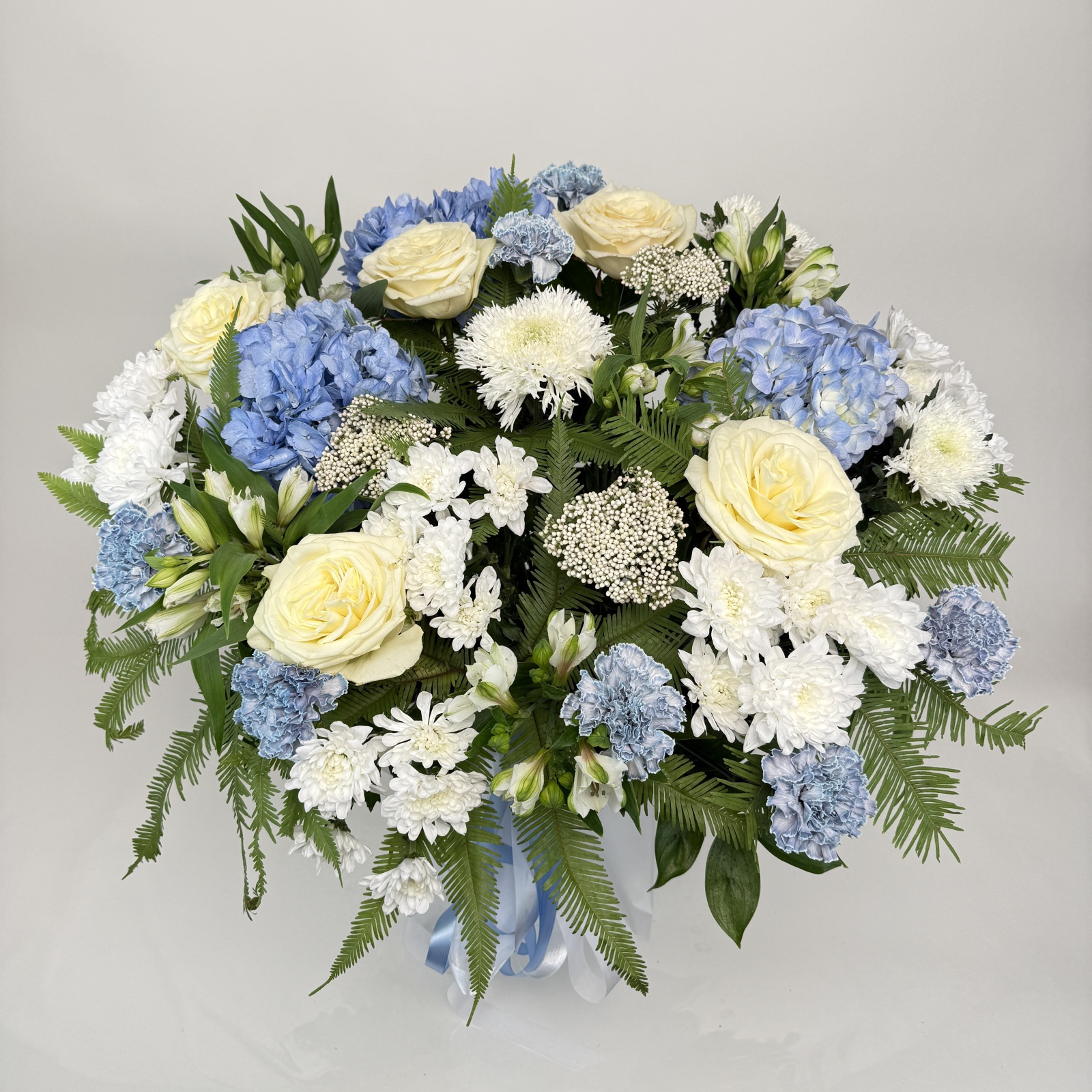 Состав: роза 8, гвоздика 7, хризантема кустовая 6, альстромерия 5, хризантема 3, гортензия 3, рускус 0,5 и прочее. под заказ