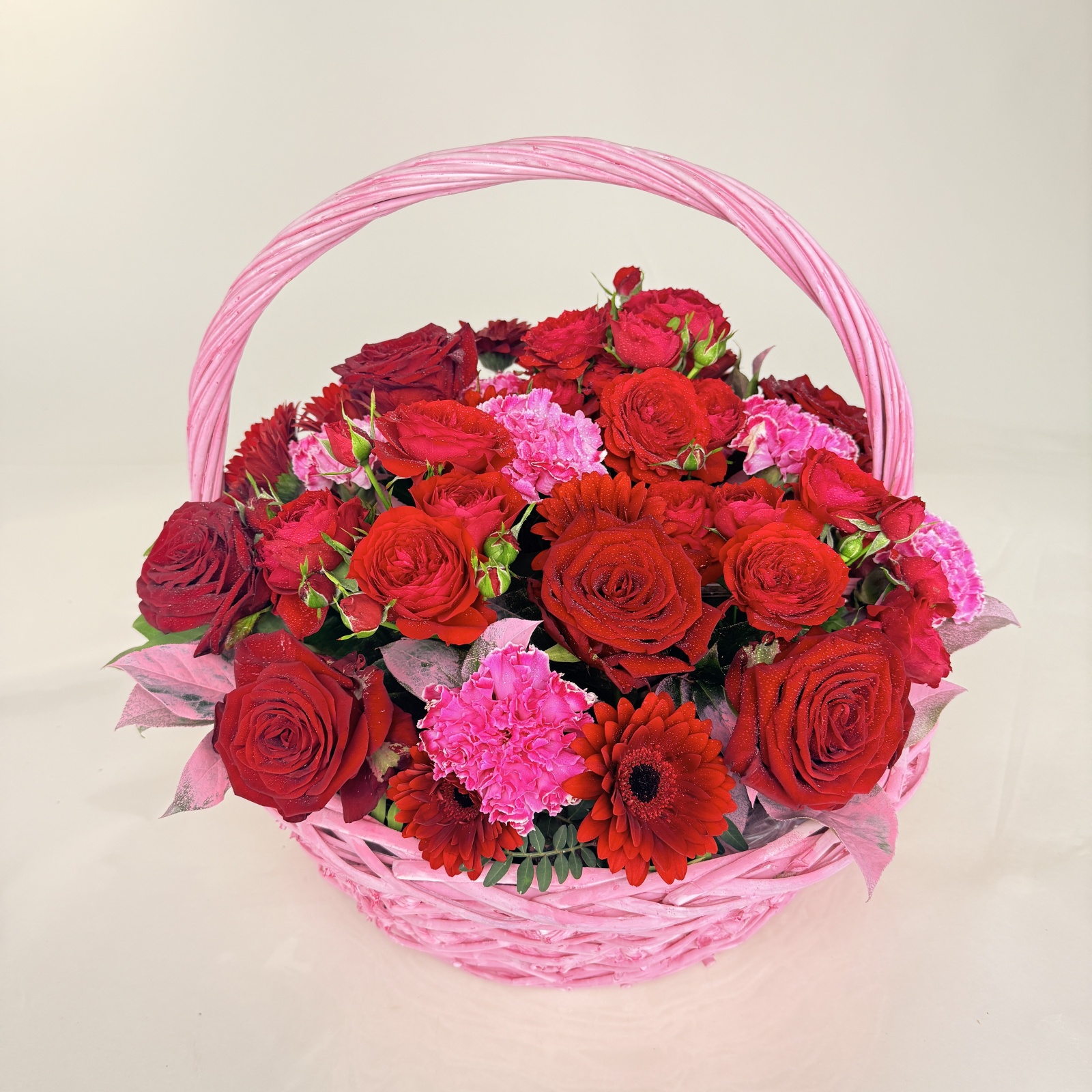 Состав: гвоздика 13, гербера 9, роза 7, роза кустовая 3, салал 0,4 и прочее.