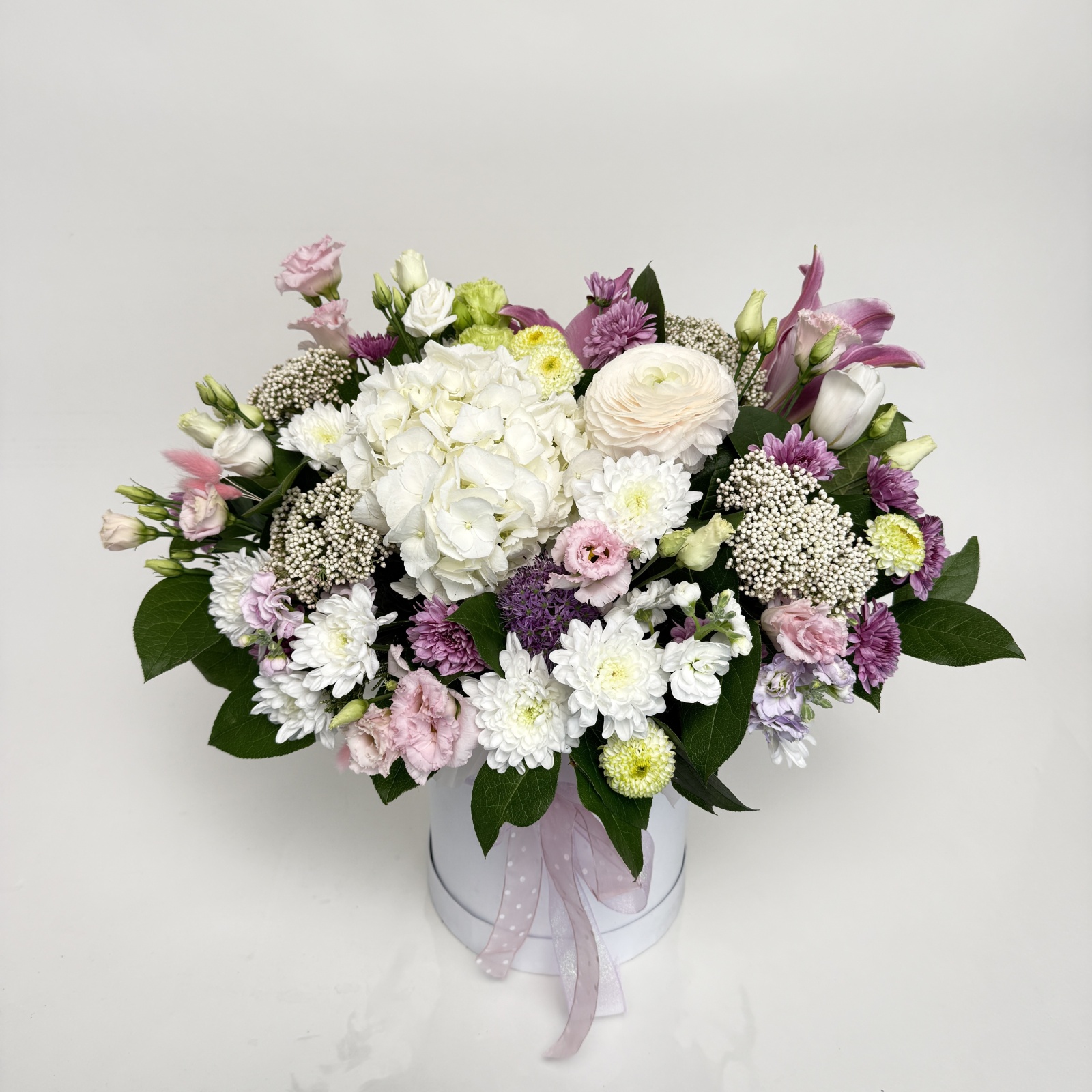 Состав: тюльпан 1, гербера 1, гортензия 1, дельфиниум 1, лилия 1, маттиола 1, ранункулюс 1, салал 0,5 и прочее. под заказ