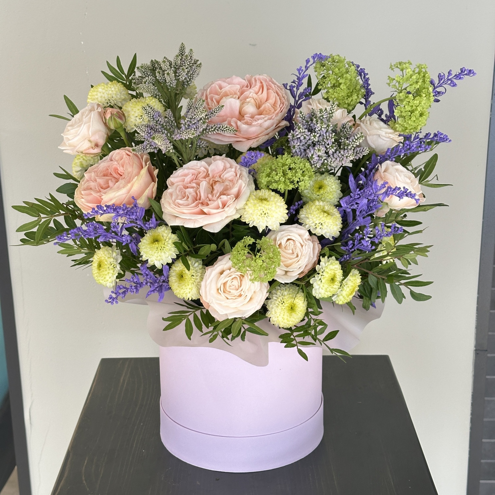 Состав: хризантема кустовая 3, вибурнум 1, солидаго 1, фисташка 1, роза кустовая 1 и прочее.