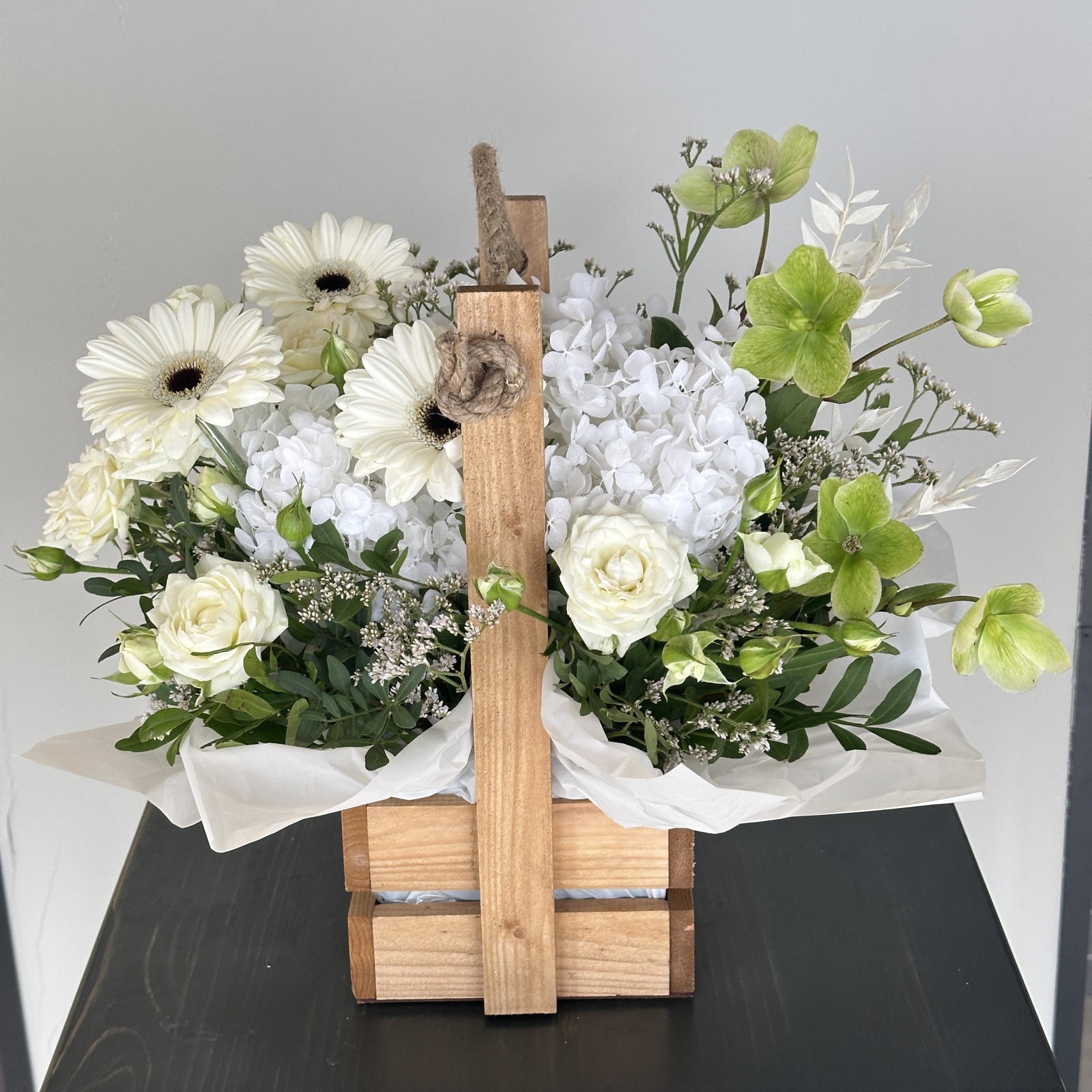 Состав: гербера 3, лимониум 2, рускус 1, роза кустовая 1, хеллеборус 1, фисташка 0,3 и прочее. в наличии