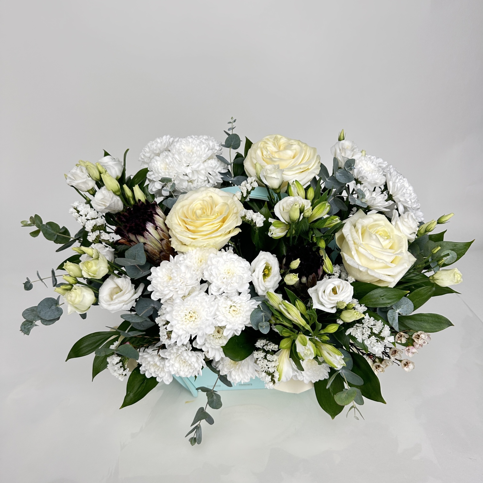 Состав: роза 3, хризантема кустовая 3, альстромерия 2, лизиантус 2, статица 1, рускус 0,5 и прочее. под заказ