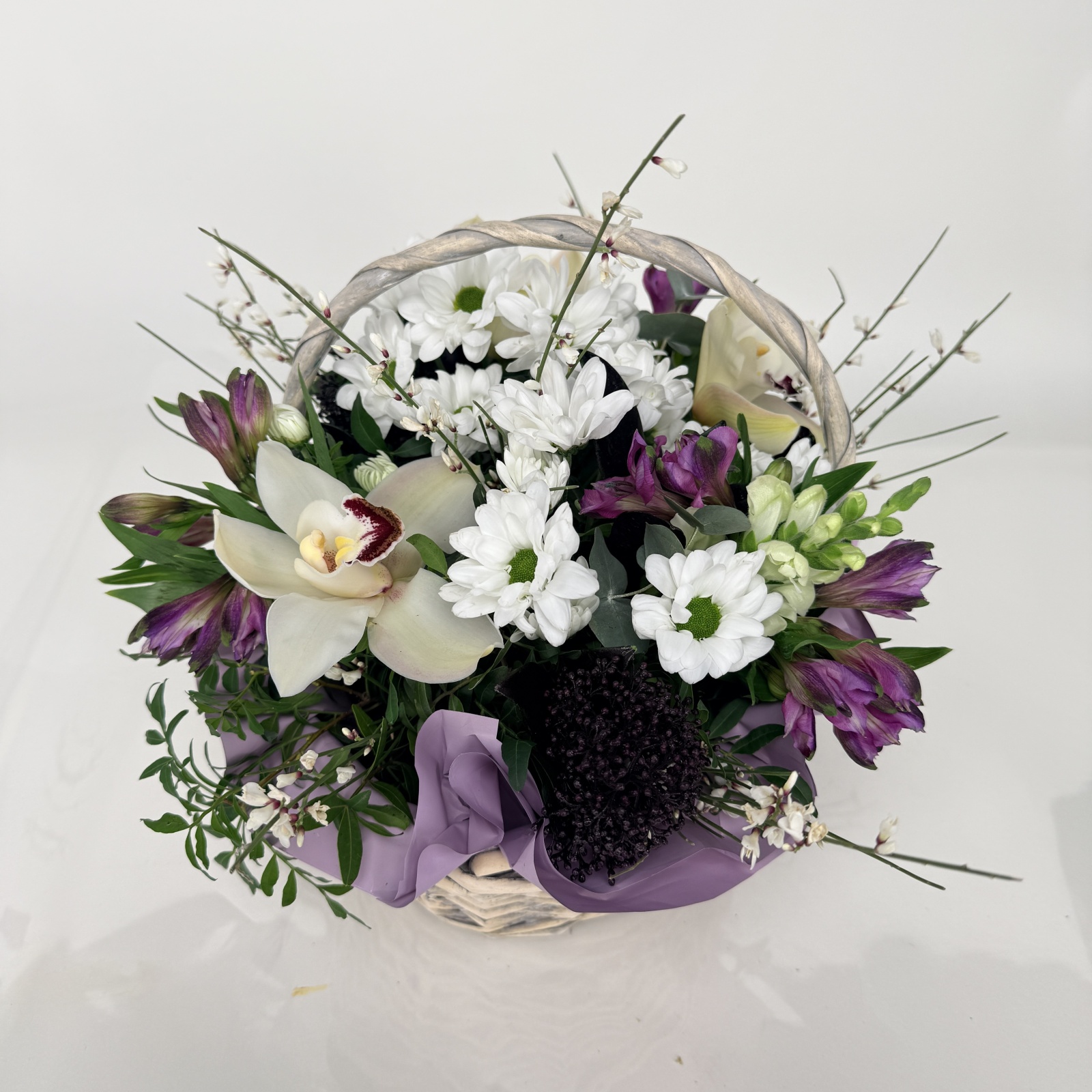 Состав: альстромерия 3, хризантема кустовая 2, антирринум 1, эвкалипт 1, фисташка 0,5, ветка цимбидиум 0,2 и прочее. под заказ