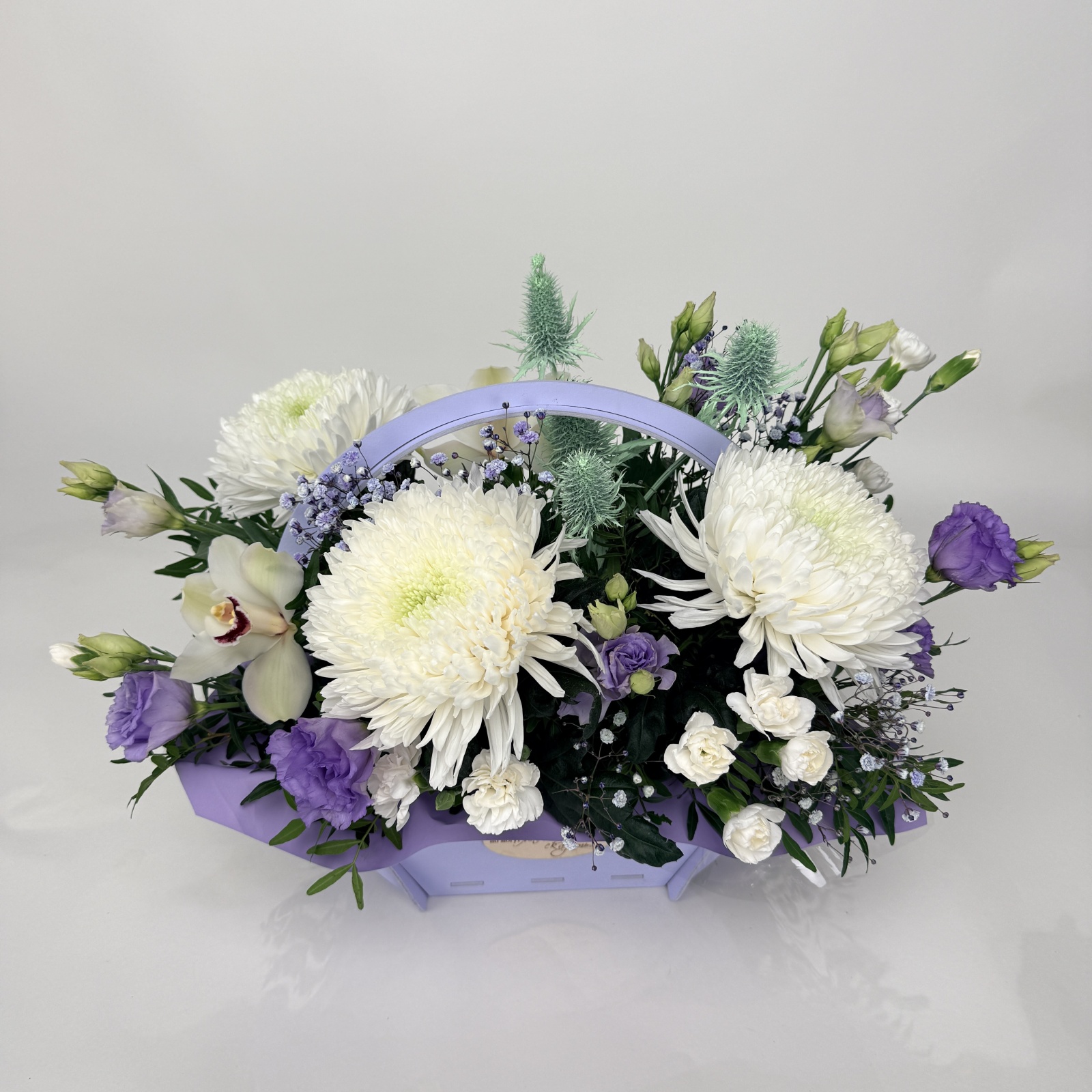 Состав: хризантема 3, гвоздика 3, лизиантус 2, эрингиум 1, фисташка 0,5, ветка цимбидиум 0,1 и прочее. под заказ