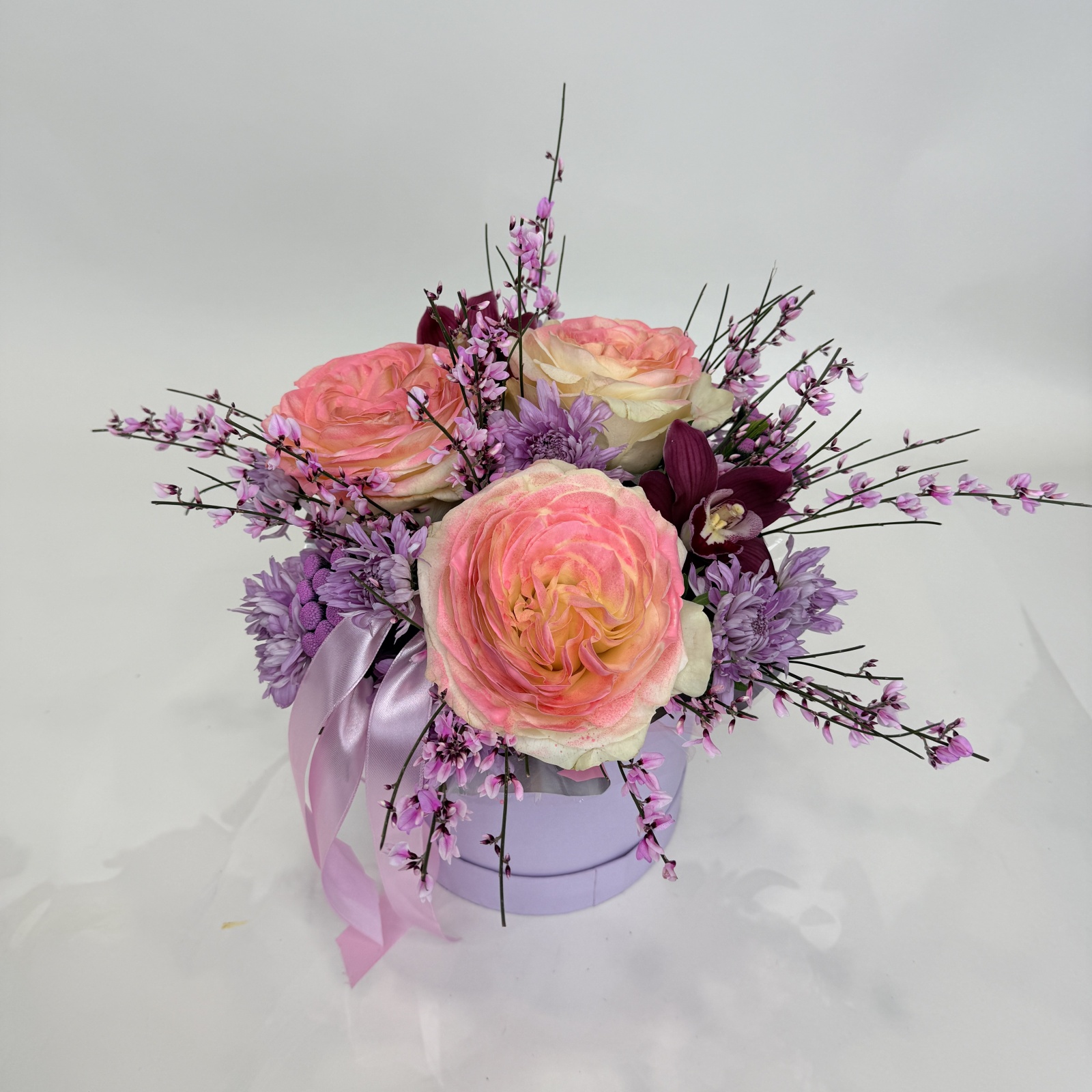 Состав: гвоздика 3, хризантема кустовая 2, бруния 2, ветка цимбидиум 0,1 и прочее. под заказ