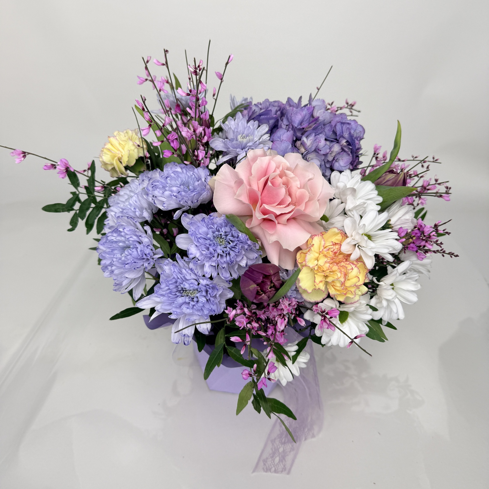 Состав: гвоздика 5, тюльпан 3, роза 3, хризантема кустовая 2, гортензия 1, фисташка 0,5 и прочее. под заказ