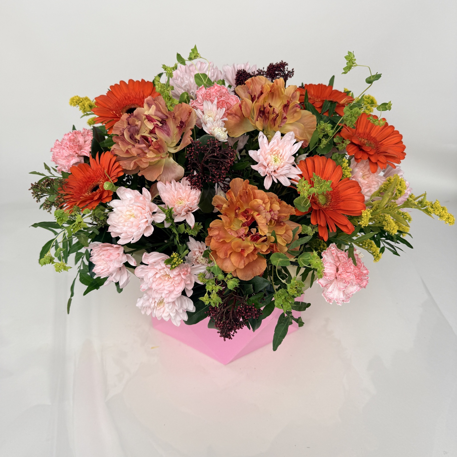Состав: гербера 4, ранункулюс 4, солидаго 3, гвоздика 3, роза 2, гладиолус 1 и прочее. под заказ