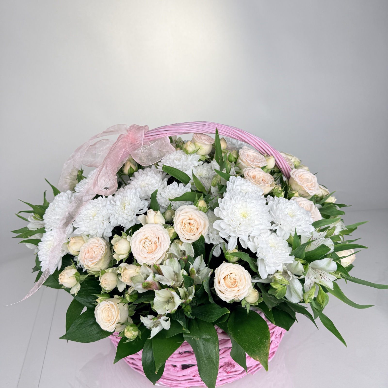 Состав: альстромерия 8, роза кустовая 5, хризантема кустовая 5, рускус 1 и прочее.
