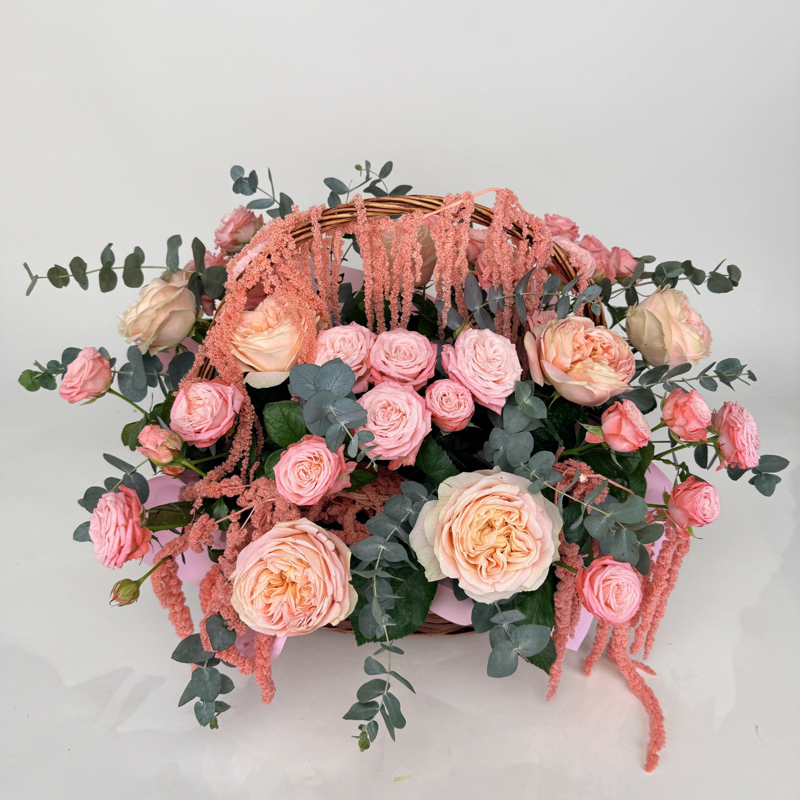 Состав: роза 7, роза кустовая 5, эвкалипт 3, рускус 0,5 и прочее. под заказ