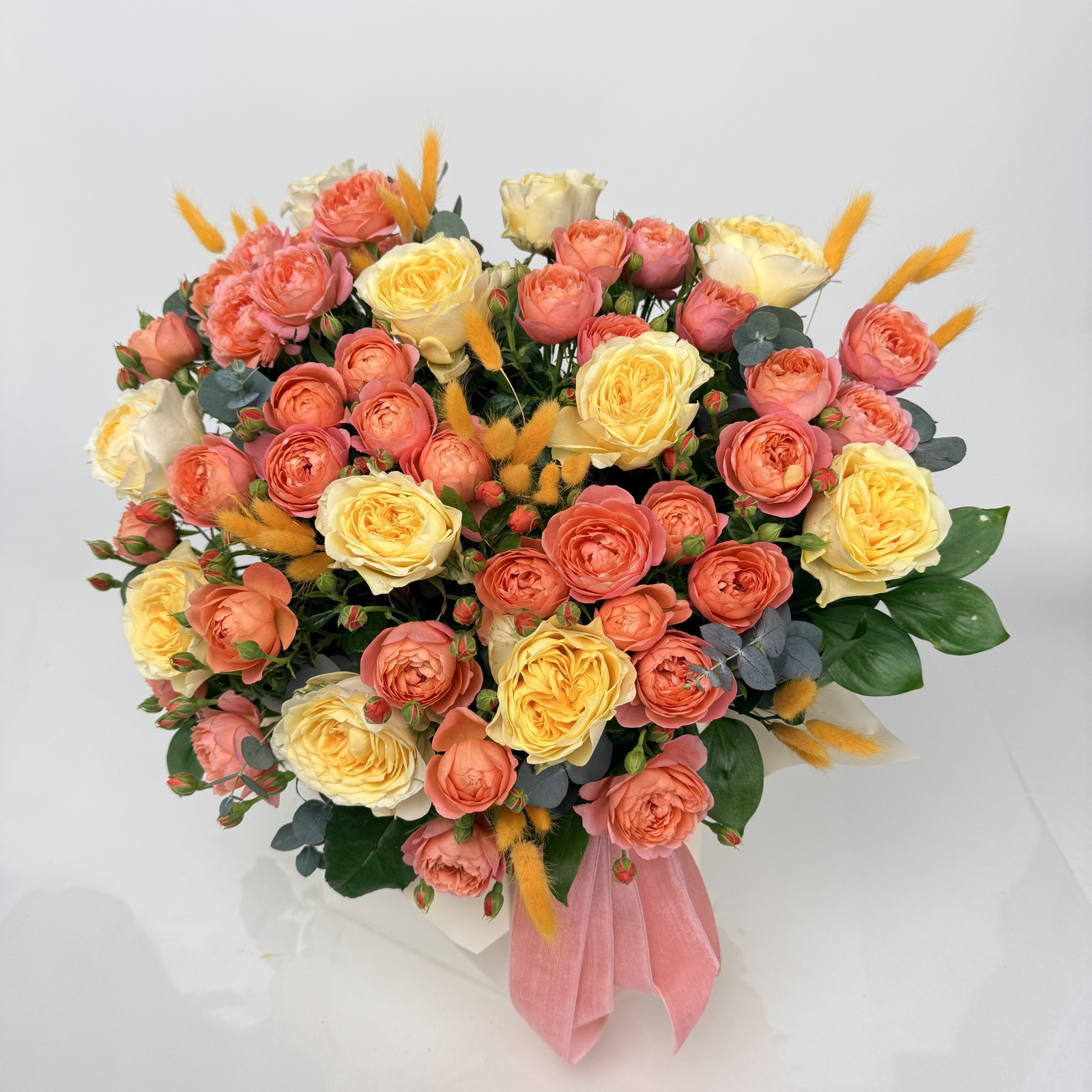 Состав: роза 11, роза кустовая 5, эвкалипт 2, рускус 0,5 и прочее. под заказ