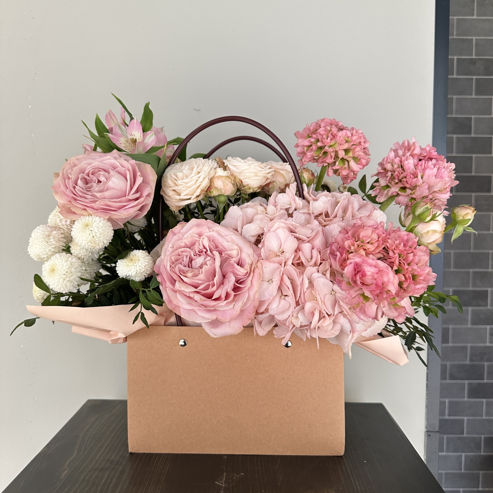Состав: ранункулюс 3, роза 2, хризантема кустовая 2, гортензия 1, альстромерия 1, роза кустовая 1, фисташка 0,3 и прочее. под заказ
