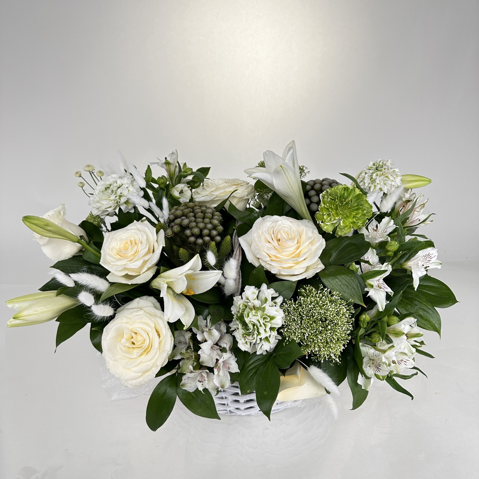 Состав: роза 5, альстромерия 5, ранункулюс 4, лилия 2, бруния 2, рускус 0,5 и прочее.