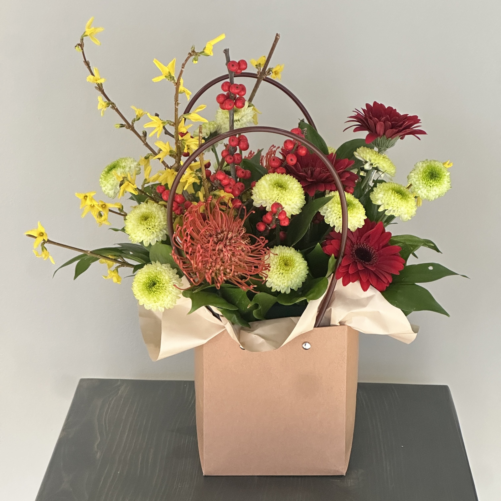 Состав: гербера 3, хризантема кустовая 2, рускус 0,5 и прочее.