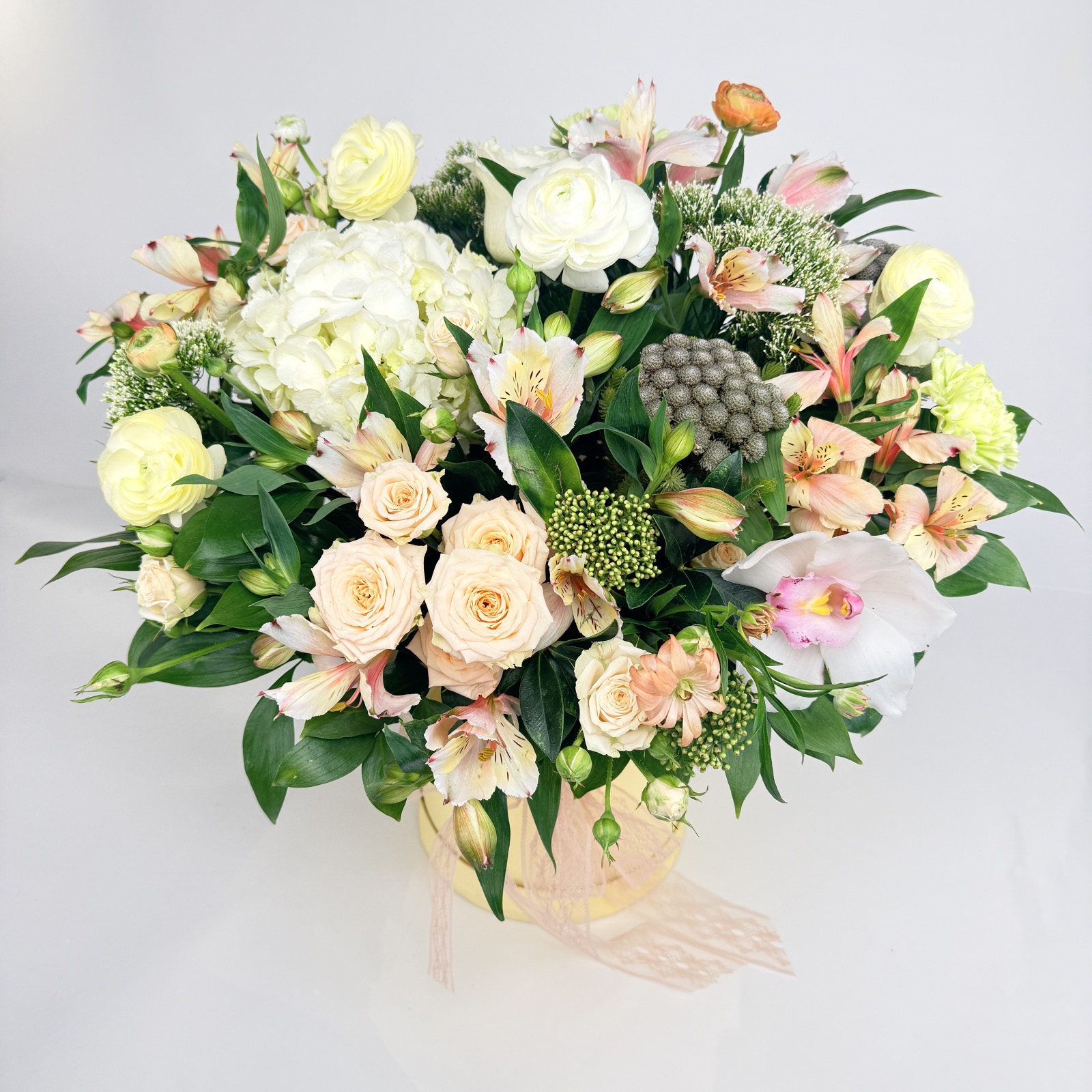 Состав: ранункулюс 6, альстромерия 5, гвоздика 4, роза кустовая 2, бруния 2, роза 1, гортензия 1, рускус 0,5 и прочее. под заказ