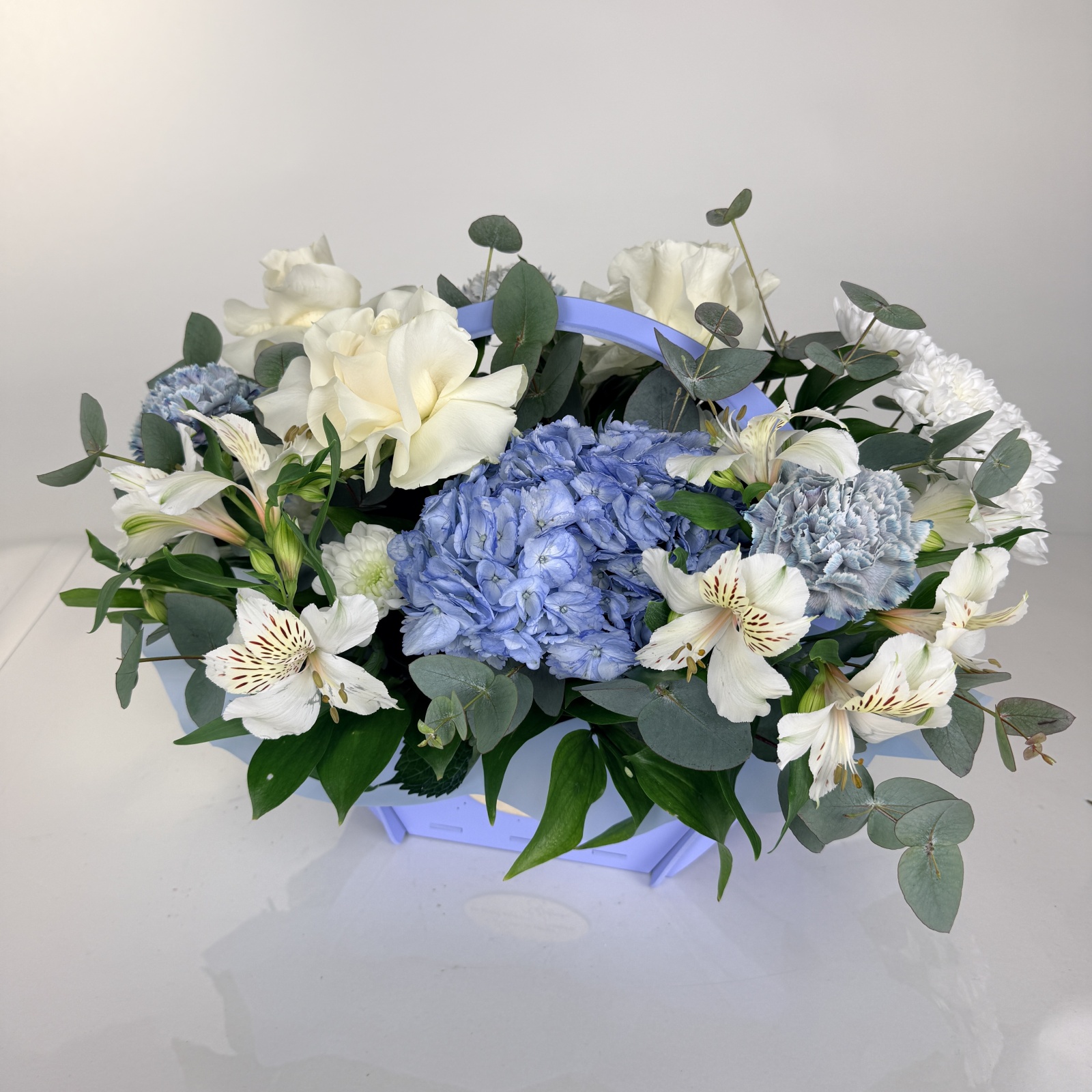 Состав: роза 4, гвоздика 3, хризантема кустовая 2, гортензия 2, альстромерия 2, эвкалипт 1, рускус 0,5 и прочее.