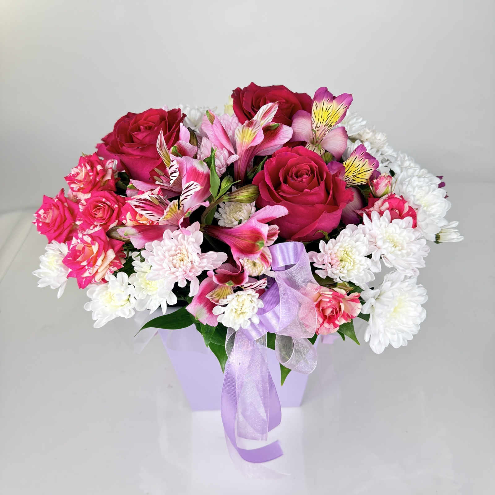 Состав: роза 4, альстромерия 2, гвоздика 1, роза кустовая 1, хризантема кустовая 1 и прочее. под заказ