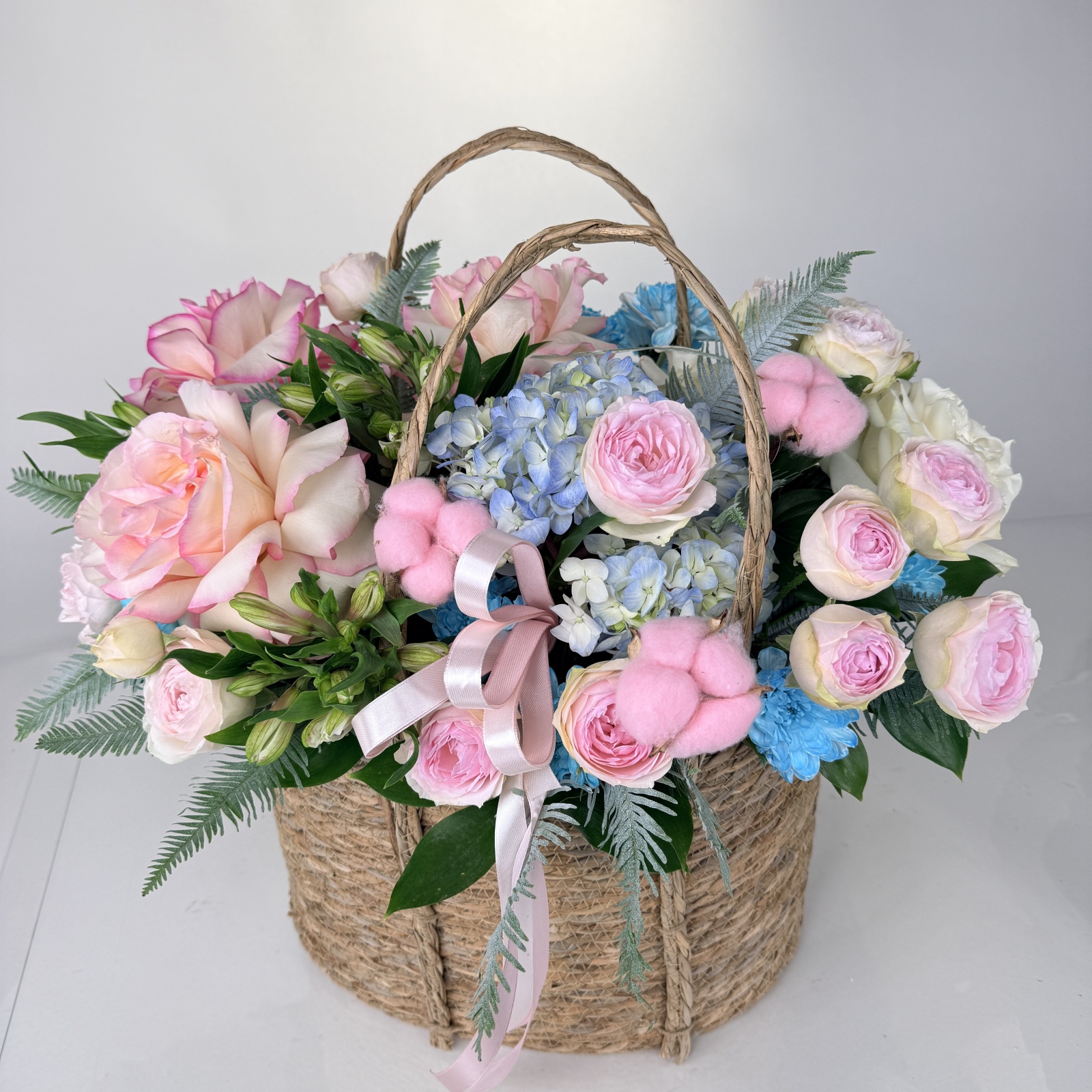 Состав: роза 3, альстромерия 3, роза кустовая 2, гортензия 1, вибурнум 1, рускус 1 и прочее. под заказ