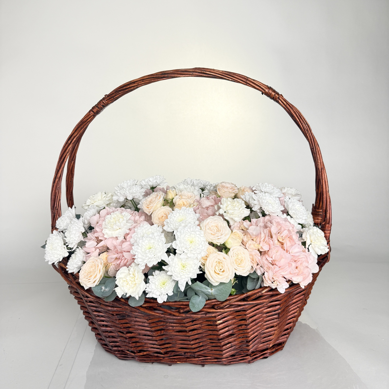 Состав: гвоздика 9, роза кустовая 5, хризантема кустовая 5, гортензия 5, эвкалипт 3 и прочее. под заказ