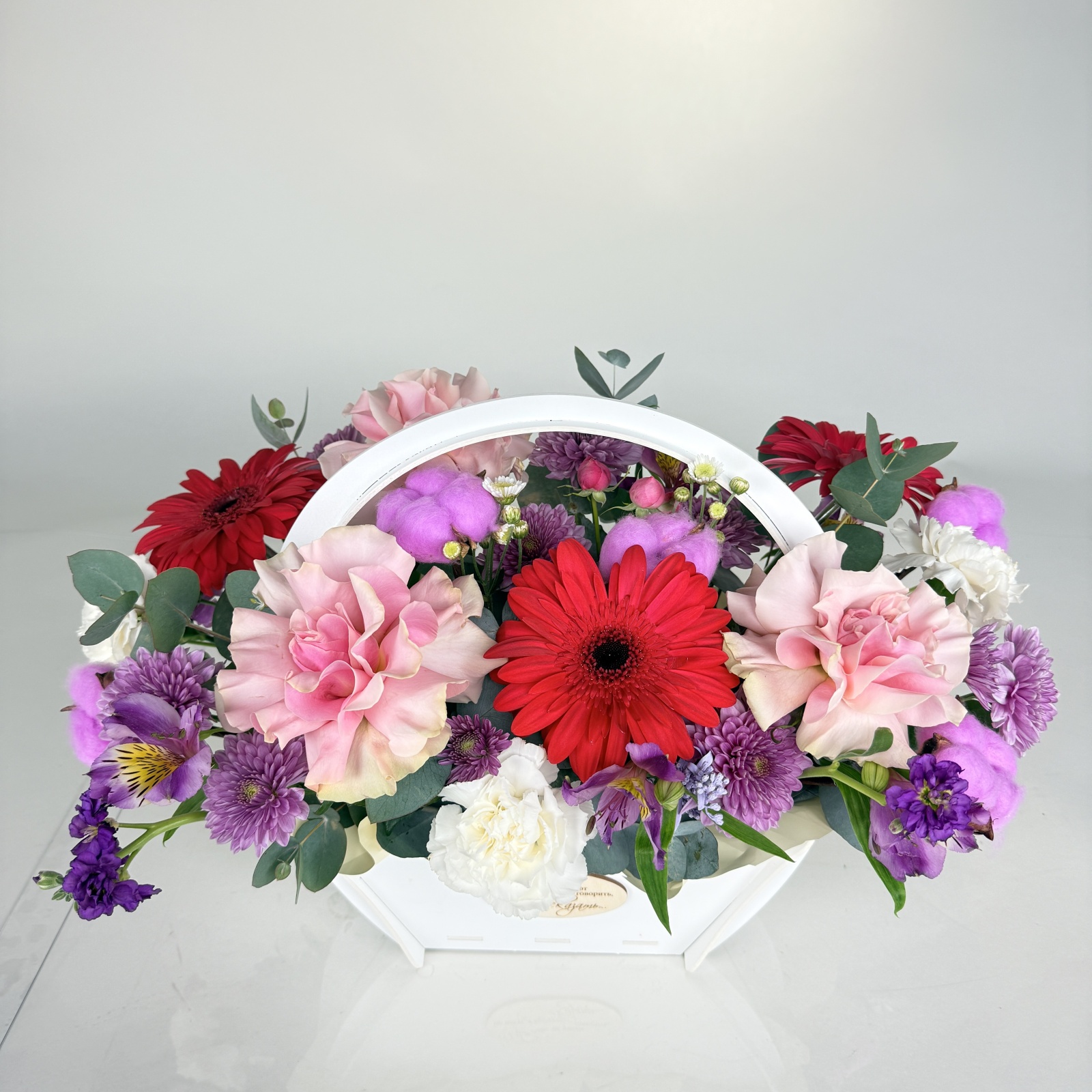 Состав: роза 3, гвоздика 3, гербера 3, альстромерия 2, хризантема кустовая 1, эвкалипт 1 и прочее. под заказ